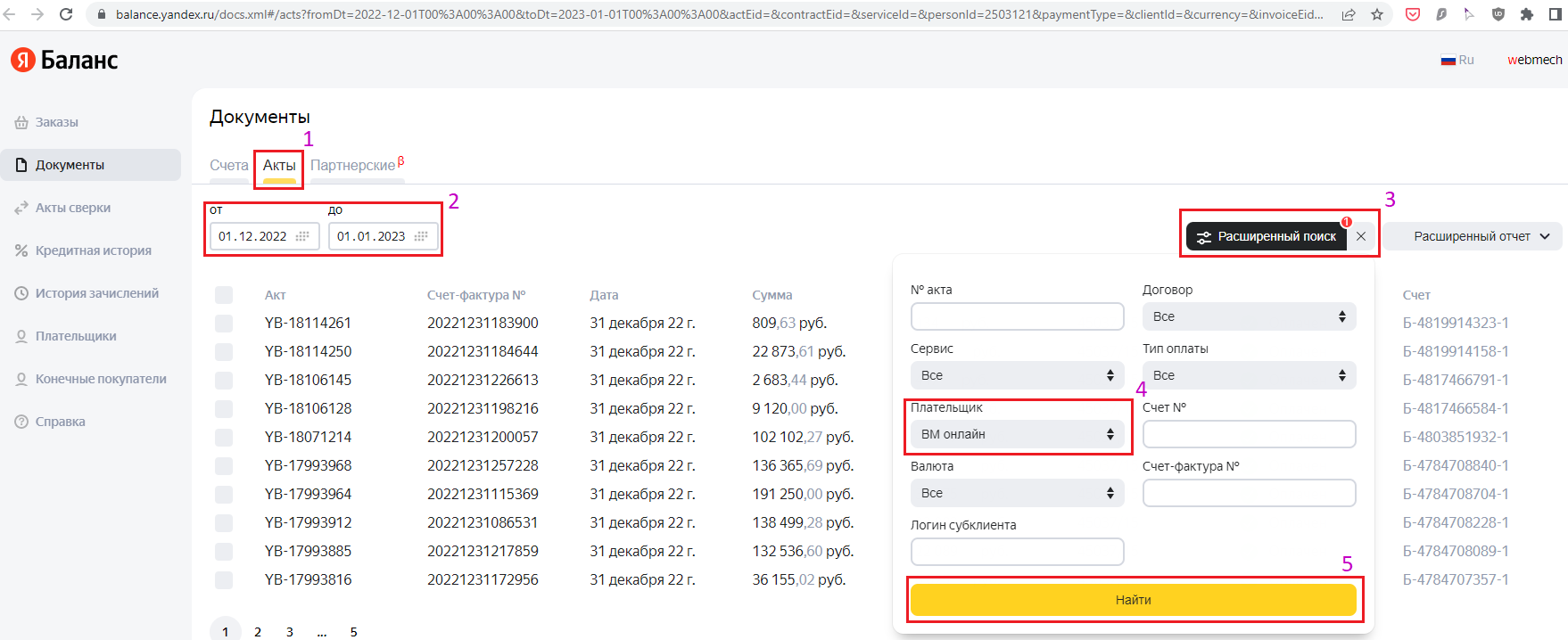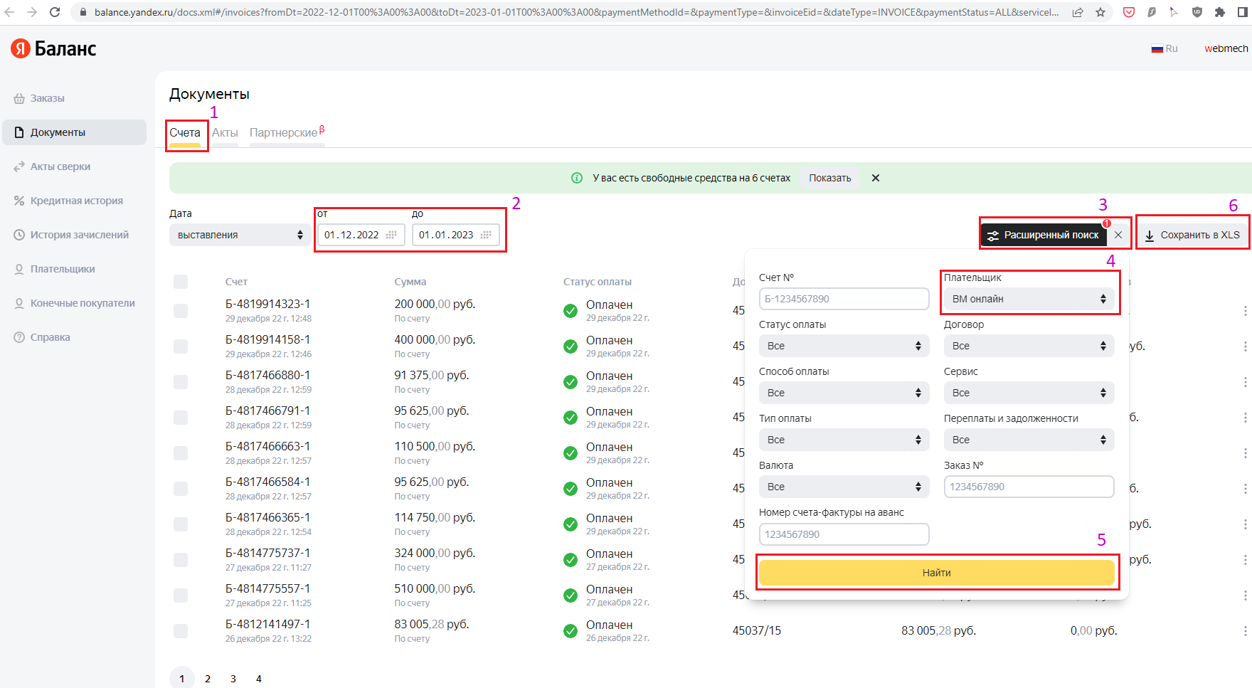 - Проставить фильтр по дате от, до, плательщику - см. рис.4 пп.1-5.